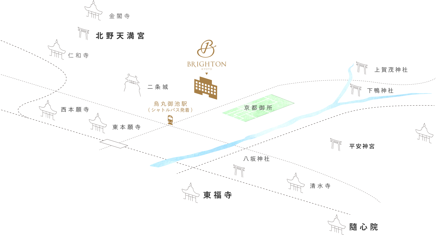 当ホテルは茶道三千家や寺社仏閣、名所、さらに歴史ある大学などに囲まれた閑静な住宅街にたたずんでおり、