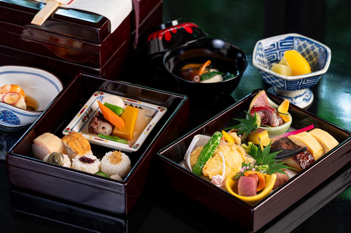 お一人様 5,500円祇園祭の「くじ改め」由来の結び方で結われた二段重のお弁当。彩り鮮やかなお料理の数々が並びます。 -