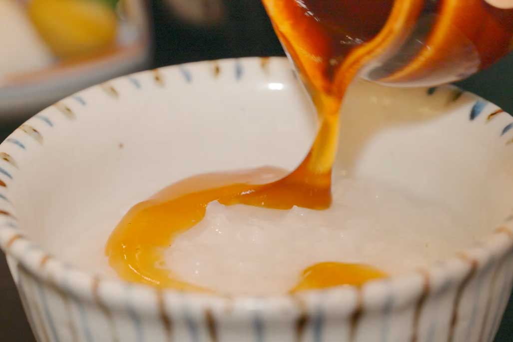 生米から約1時間かけて炊き上げるお粥には、薄口・濃口醤油にみりん、かつお出汁で整えた粥餡を。色目・風味・塩味のバランスが絶妙です。
