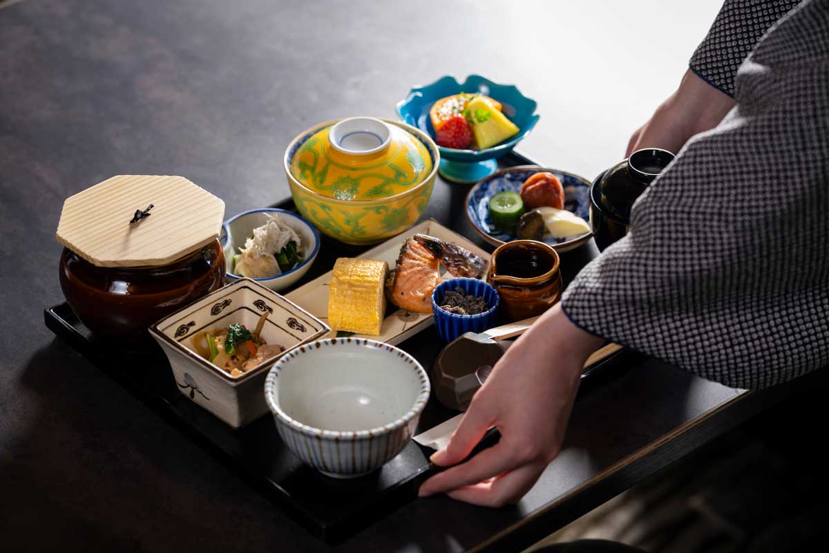 お出汁が香る和朝食は、炊き立てのご飯やお粥に、焼き鮭、出汁巻き玉子、季節の小鉢など、盛りだくさんの内容。お粥やご飯、お味噌汁のおかわりはご自由にどうぞ。