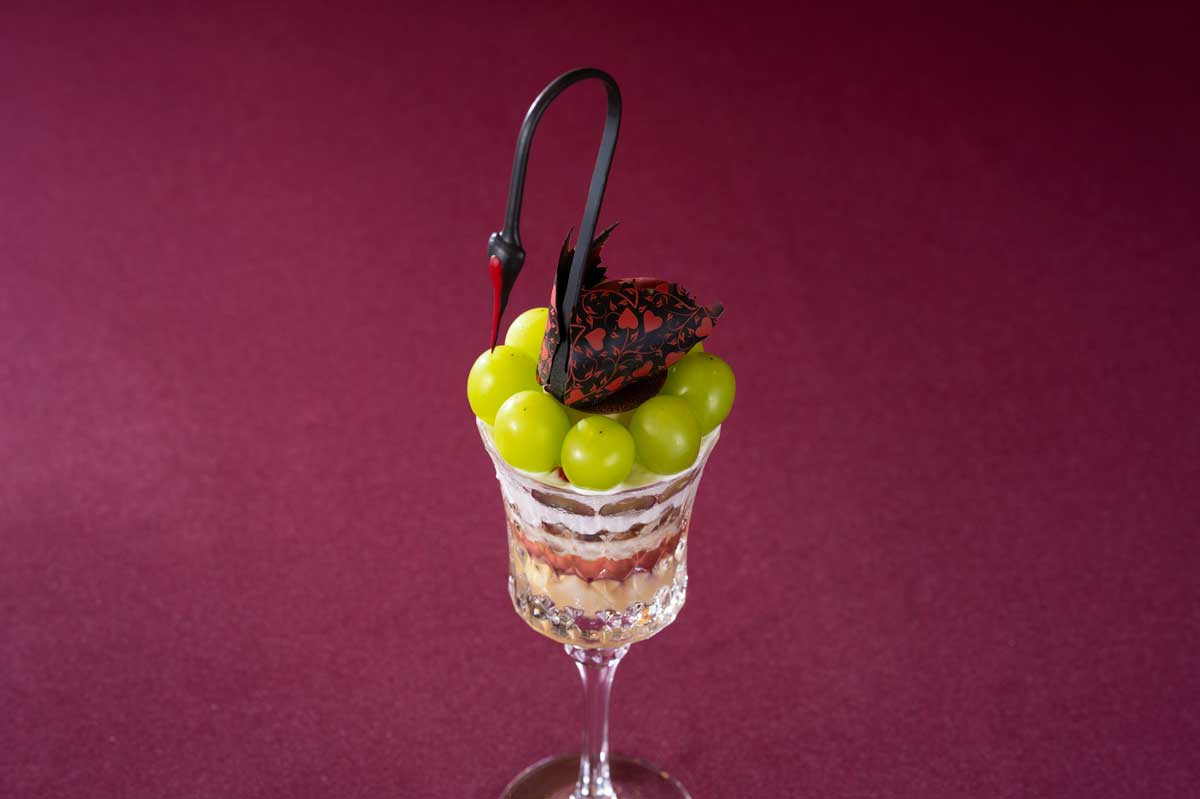 パフェ・ブラックスワンSpecial tea set アフタヌーンティーセット 5,800円Special parfait パフェ・ブラックスワン 2,400円(9~11月)開放的なロビーの中央でスイーツやカクテルが楽しめるラウンジ・バー「クー・オ・ミディ」。ぶどうや栗、さつまいもなど、秋の味覚が織りなす至福のスイーツタイムをお届けします。