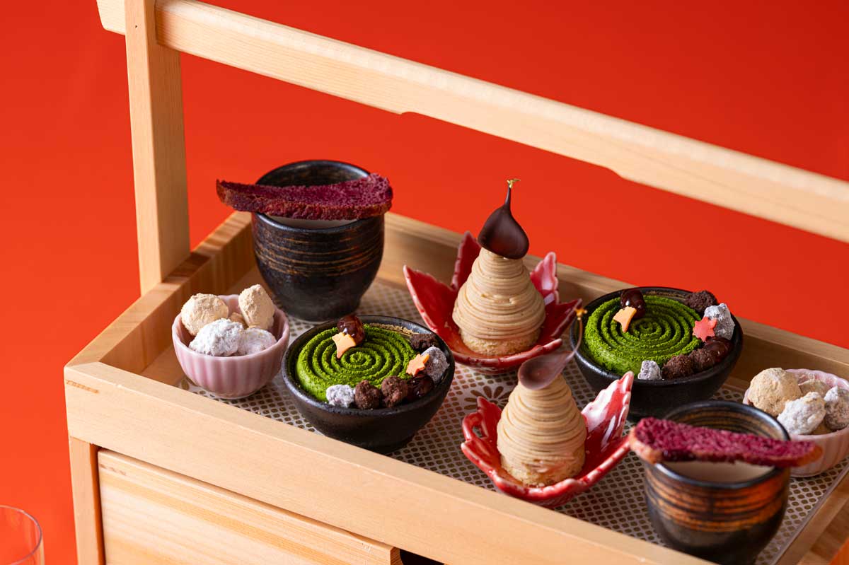 ひとつひとつが可愛いスイーツ程よい甘さの和栗モンブランや苔庭のようなティラミス、紅はるかのスープなど、紅葉を眺める雅なひとときをイメージしたスイーツを揃えました。