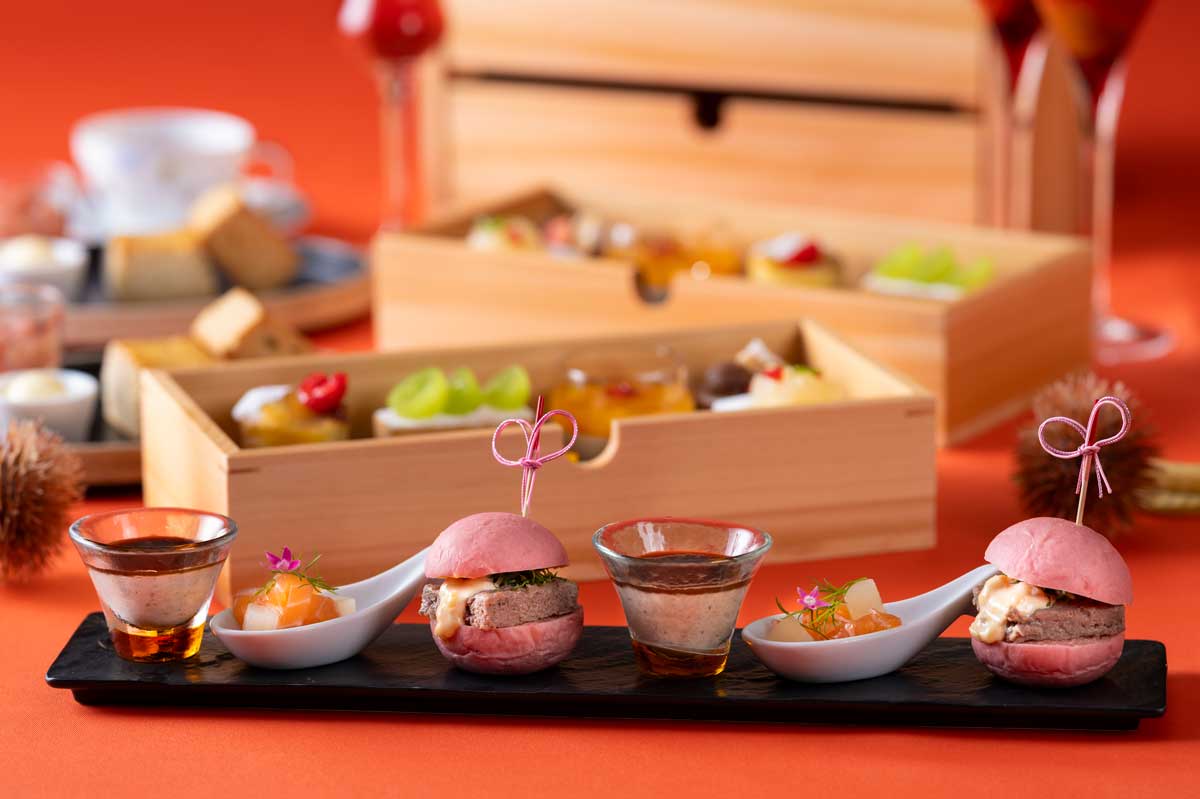 セイボリーにも注目今秋は、松茸香るきのこのフランや米沢牛のミニバーガーなど本格セイボリーがラインナップ。〆パフェとティーフリーフローも付いた充実の内容です。