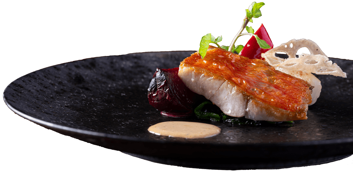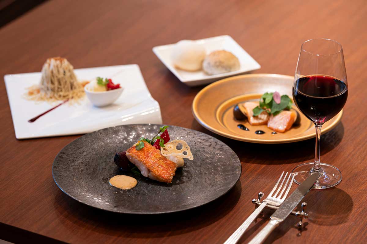 小野甚味噌醤油店 黒豆味噌のバターソースLunch モン デジュネ 5,500円Dinner ディネ プリフィックス 6,800円種類豊富なブッフェに選べる前菜と美しいメインディッシュがセットのメニューが人気。ディナーを楽しむなら、金目鯛の上品な脂の旨味と黒豆味噌のまろやかなソースとの相性がよい自慢の一皿をどうぞ。