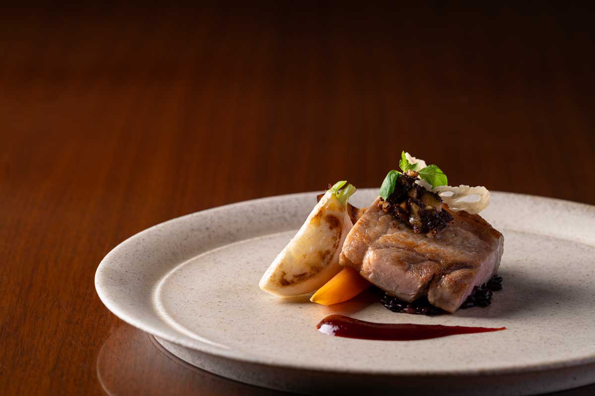 自慢の選べるメインディッシュ外は香ばしく中はしっとりと焼き上げたポークローストに、京都・伊根の地酒 伊根満開の酒粕をナッペした甘酸っぱい華やかな味わいの一皿です。