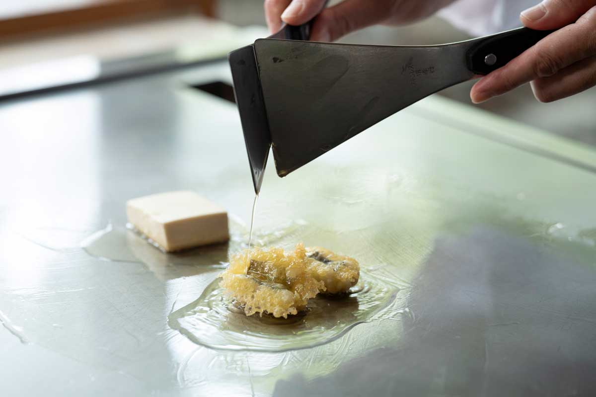 楽しむ天ぷら鱧は鉄板の上でふんわりサクッとした天ぷらに、お豆腐は香ばしく焼き上げます。おろしあんかけとあわせてさっぱりとお召し上がりください。