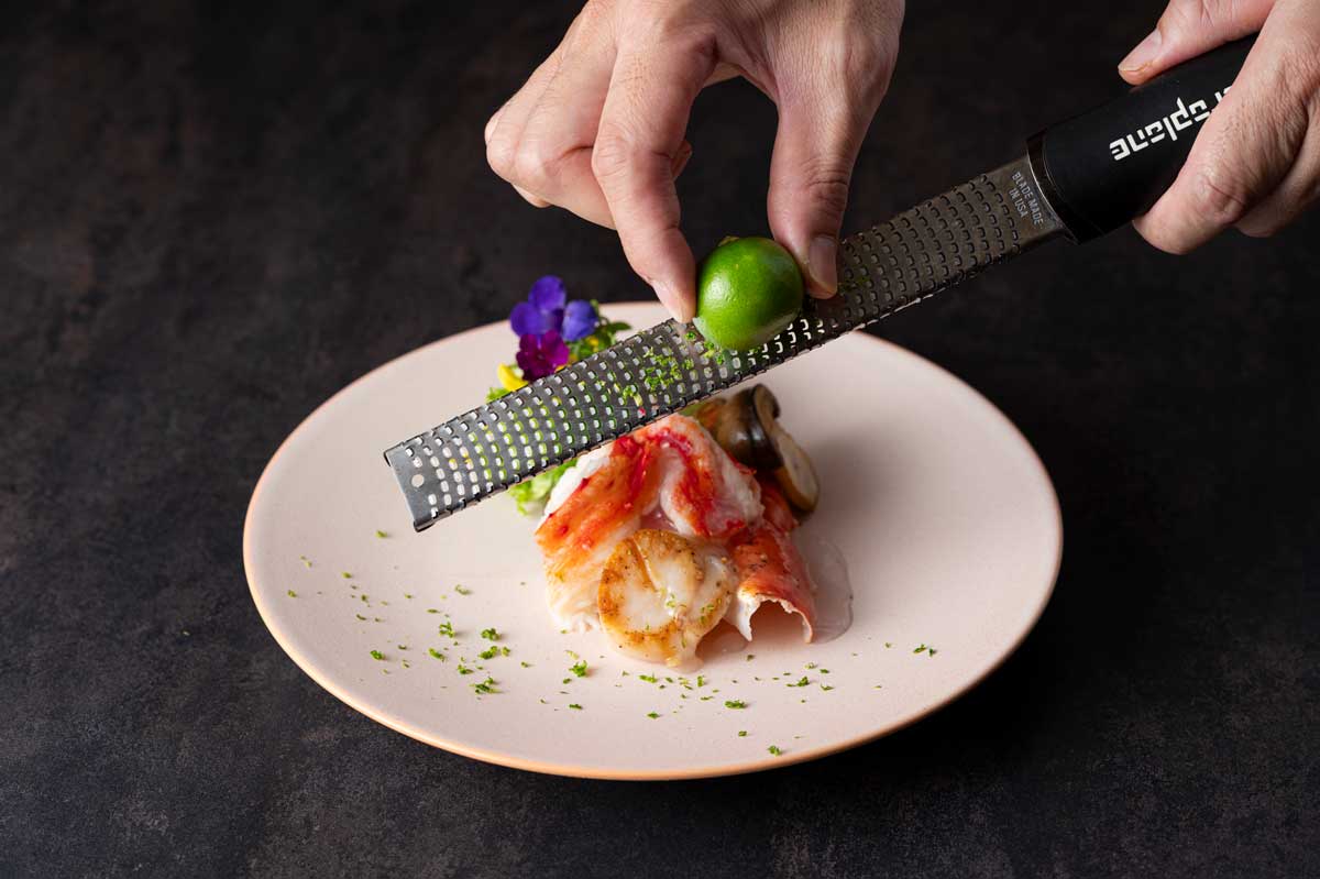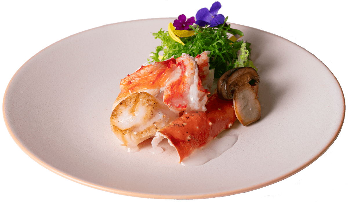 存分に味わう一皿カボスが香るシークラムソースは、深みがありながら爽やかな味わい。タラバガニと帆立貝柱の素材の旨味を引き出します。