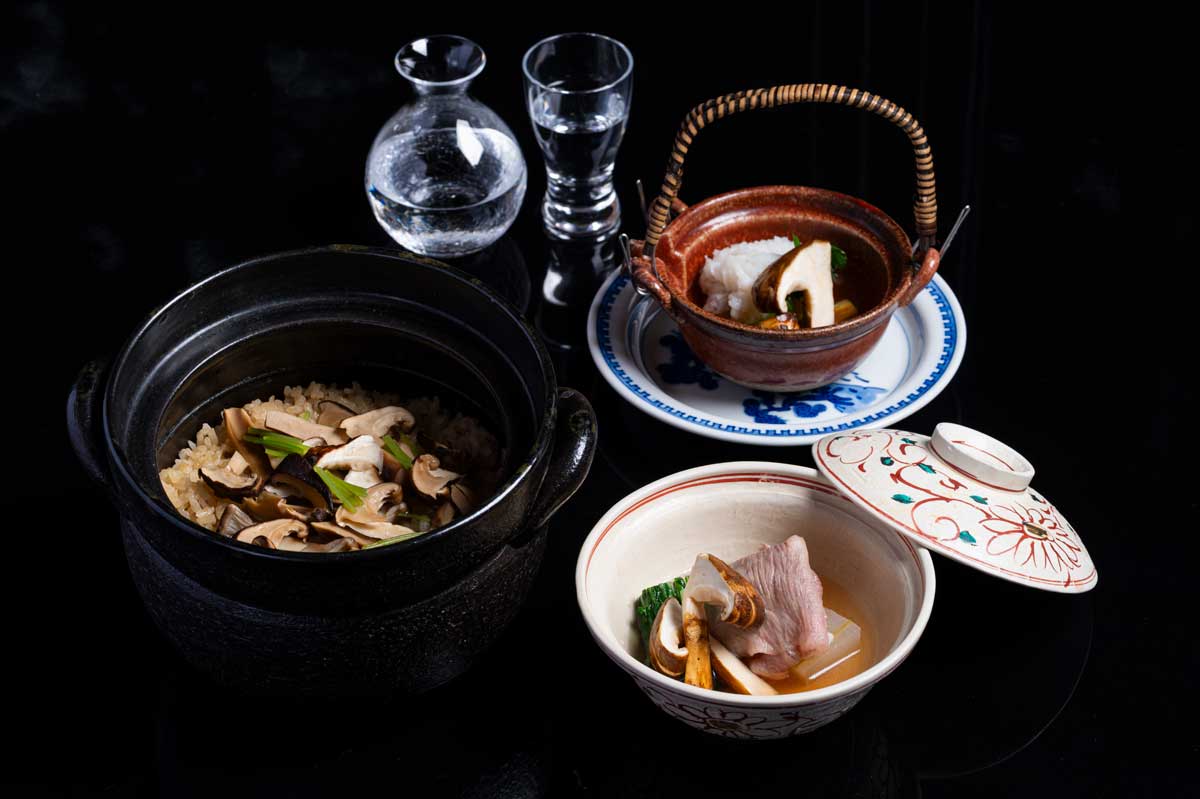 松茸を楽しむ京懐石ディナー先付けにはあっさりとした松茸と茸おろし、吸い物は出汁の効いた土瓶蒸しを。松茸と相性の良い米沢牛はしっとりと牛しゃぶに仕上げた贅沢なディナー。