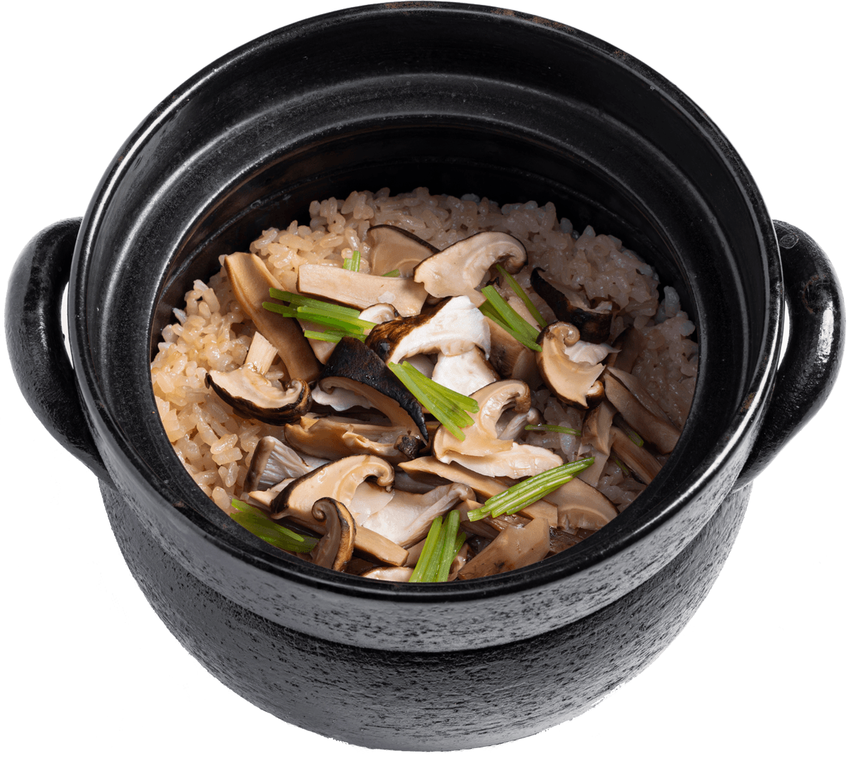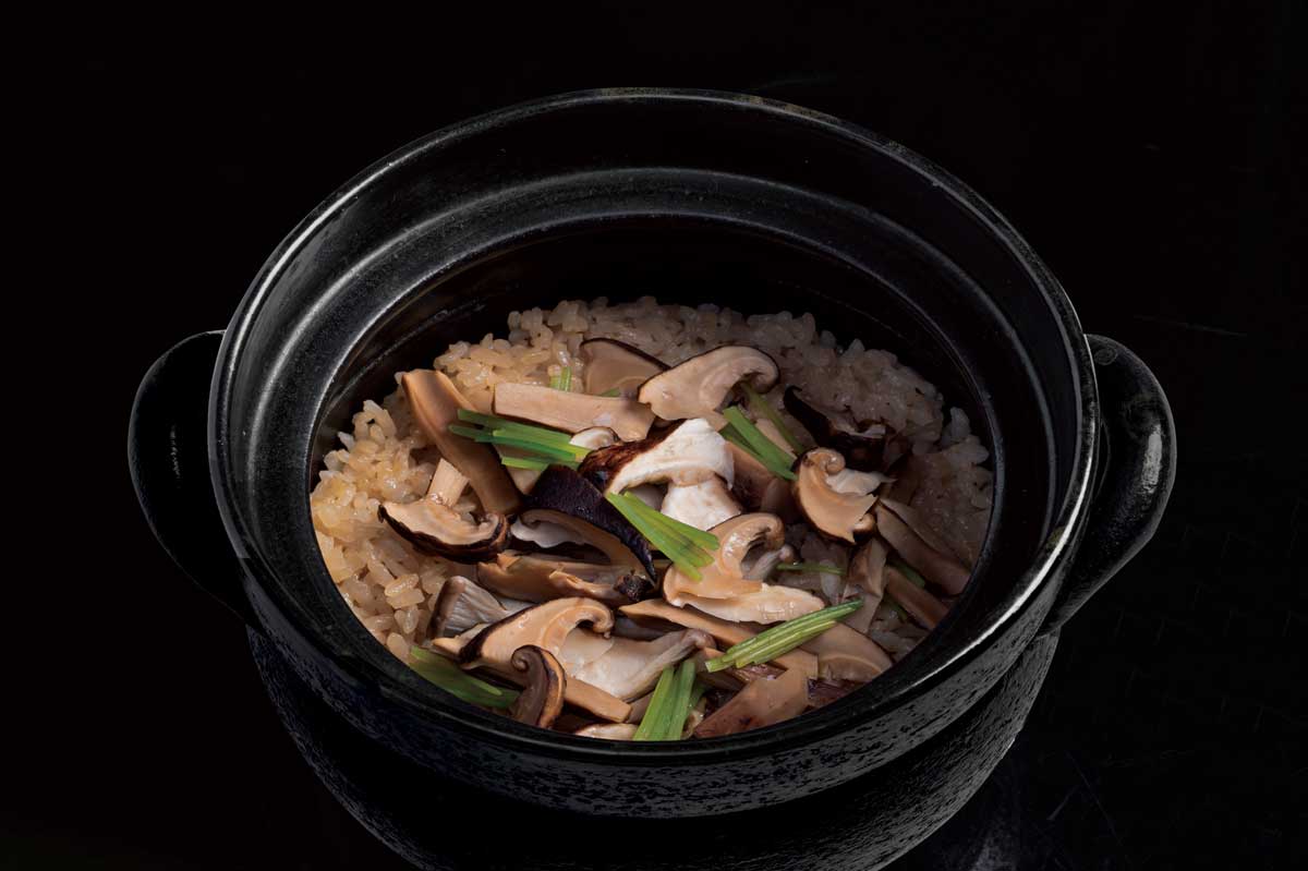 炊きたての釜炊き御飯鍋の蓋を開けると、湯気とともに立ちのぼる松茸の芳醇な香りが食欲をそそります。シャキッとした食感とふっくらとした御飯は、コースの〆に相応しい一品。
