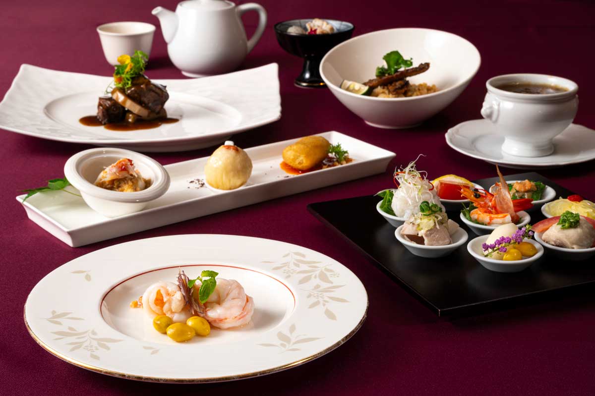 エレガントなヌーベルシノワ6品のお料理にパティシエ特製デザートと中国茶までついた人気のコース。松茸や無花果、秋刀魚など、旬の食材を花閒らしいアレンジで仕上げました。