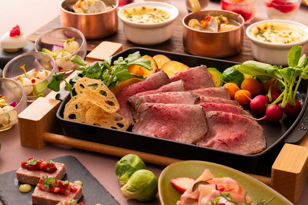 ランチブッフェ苺スイーツに根菜や鮟鱇を使ったオードブル等、季節のお料理がブッフェコーナーに勢揃い!人気のローストビーフは、平日は選べるメインディッシュに、土日祝はブッフェラインに登場。
