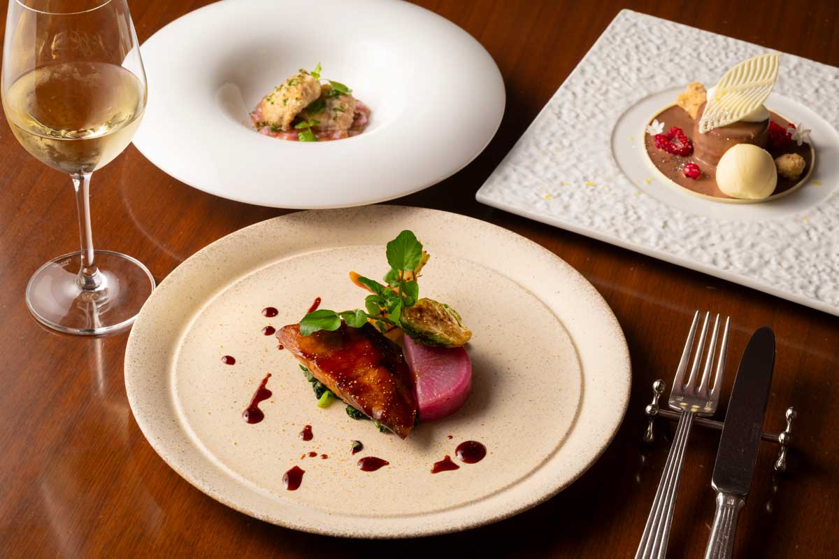 冬の柑橘のラッケ(+1,500円)Lunch モン デジュネ 5,500円Dinner ディネ プリフィックス 6,800円種類豊富なブッフェに選べる前菜と美しいメインディッシュがセットのメニューが人気。ディナーのおすすめは、良質な脂を蓄えた伊根鰤に柑橘の香りを纏わせ、外はカリっと中はふっくら焼き上げた一皿。