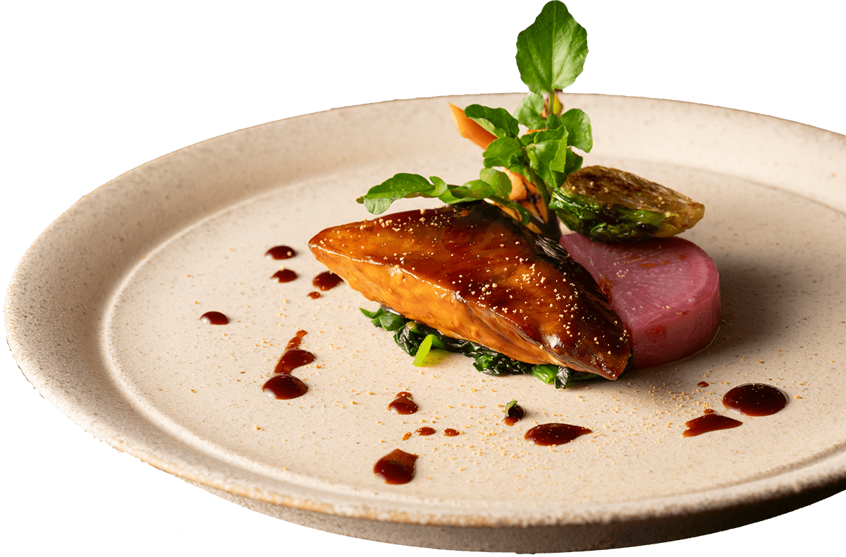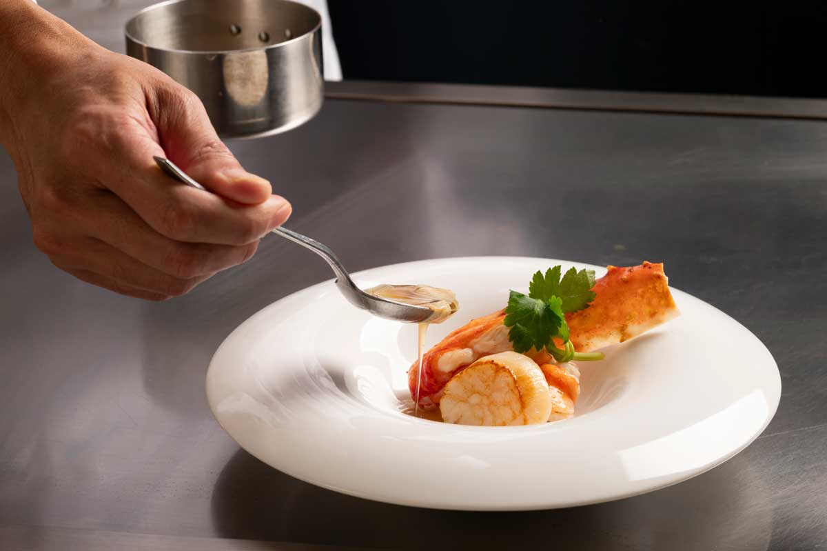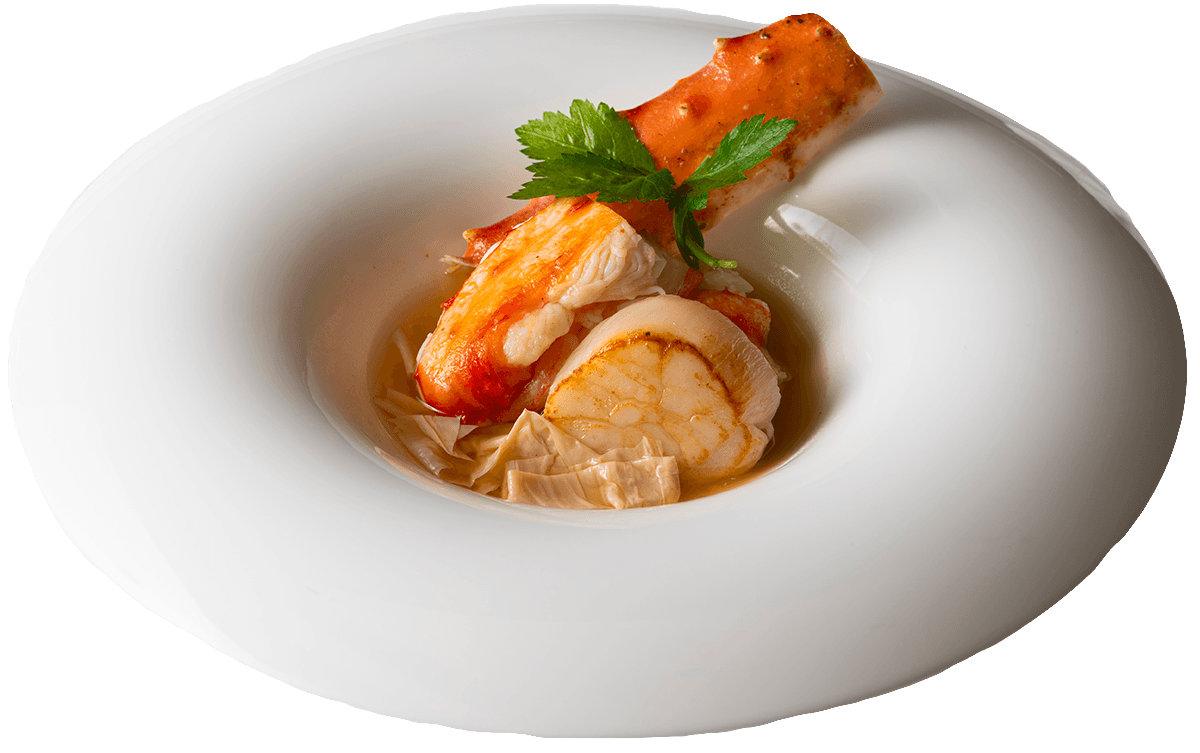 マリアージュタラバガニと帆立貝柱を丁寧に鉄板で焼き上げ、湯葉入りの和風あんを合わせたやさしい味わいの一皿。冬ならではのほっとする味わいを。
