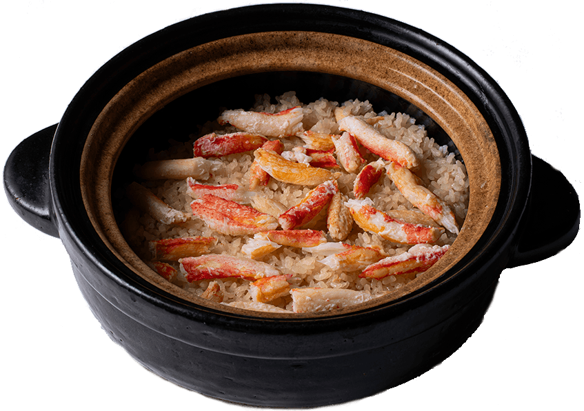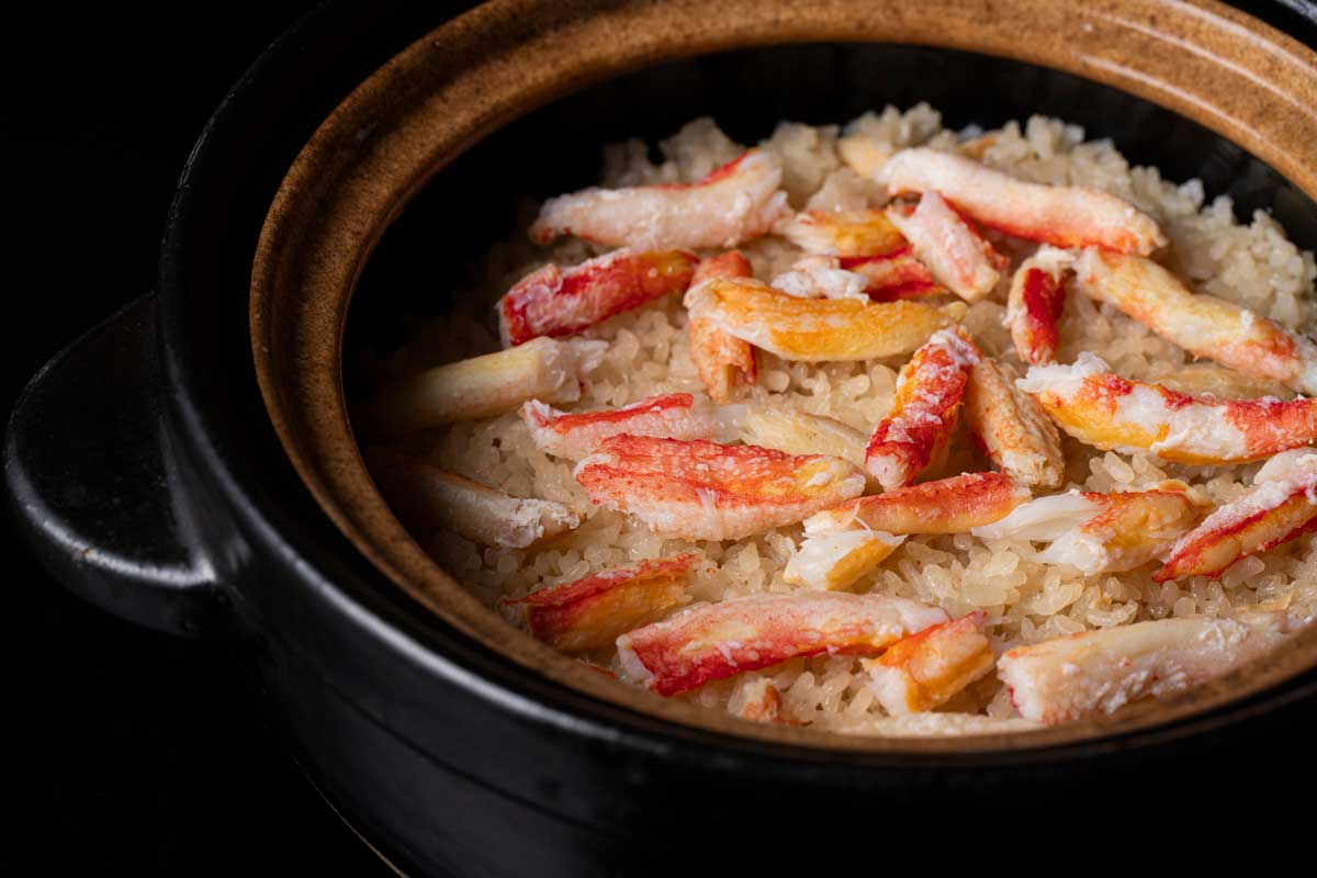 炊きたての釜炊き御飯弾力がありながらもほぐれやすい蟹身と共に、蟹の旨味とほのかな甘味が染み渡った釜炊きならではの艶やかな御飯。コースの〆に相応しい一品です。