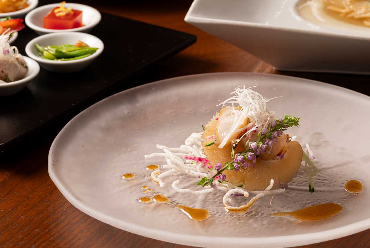 ふかひれと鮑のお刺身仕立てふかひれと鮑は食感と味わいがより楽しめるお刺身に。花椒とマスタードのソースはしびれを感じつつさっぱりとした後味が魅力です。