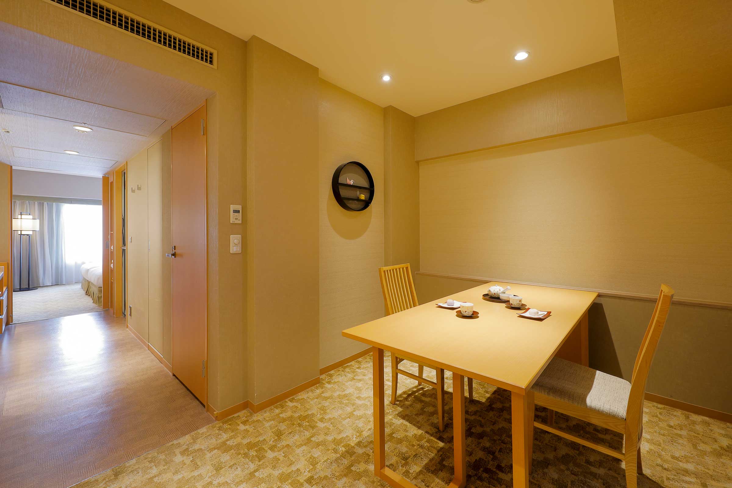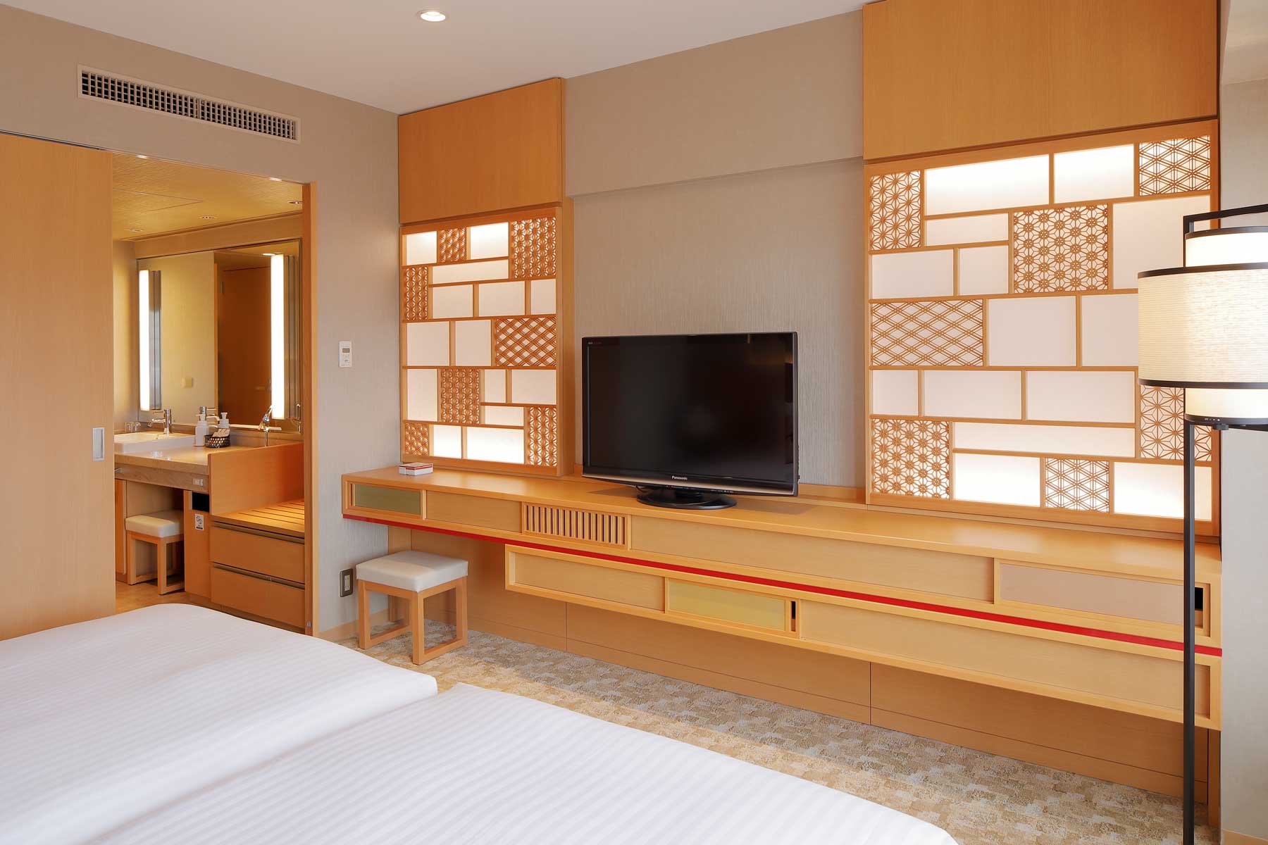和の趣あふれる色調のお部屋は、お二人でのご滞在でも各々の時間を確保できるようリビングとベッドスペースが独立。 -