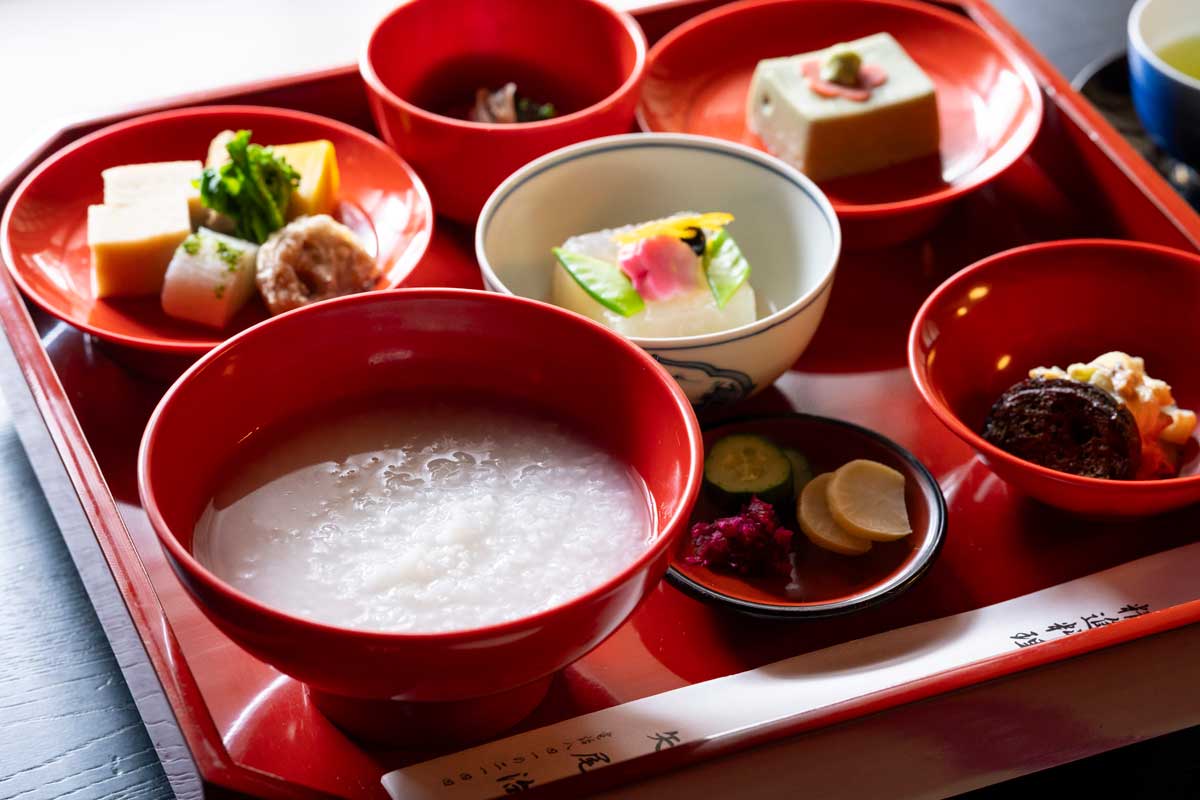 特別拝観の後は、通常非公開の特別なお部屋で「矢尾治」の精進料理をどうぞ。早朝拝観後の清々しい気持ちでいただく朝粥は格別です。
