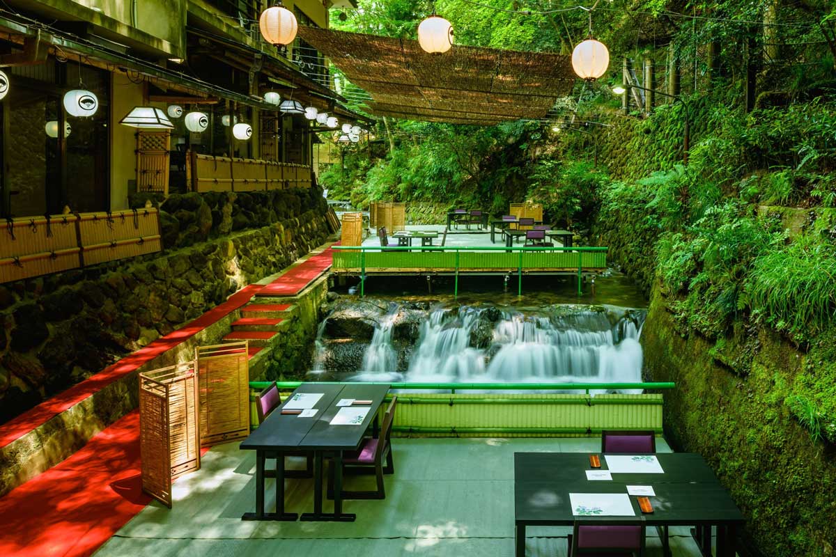 青もみじに包まれた自然豊かな山里、清滝川のせせらぎが涼やかな高雄の川床。お日にちによって源氏ボタルや京舞鑑賞のお楽しみも。